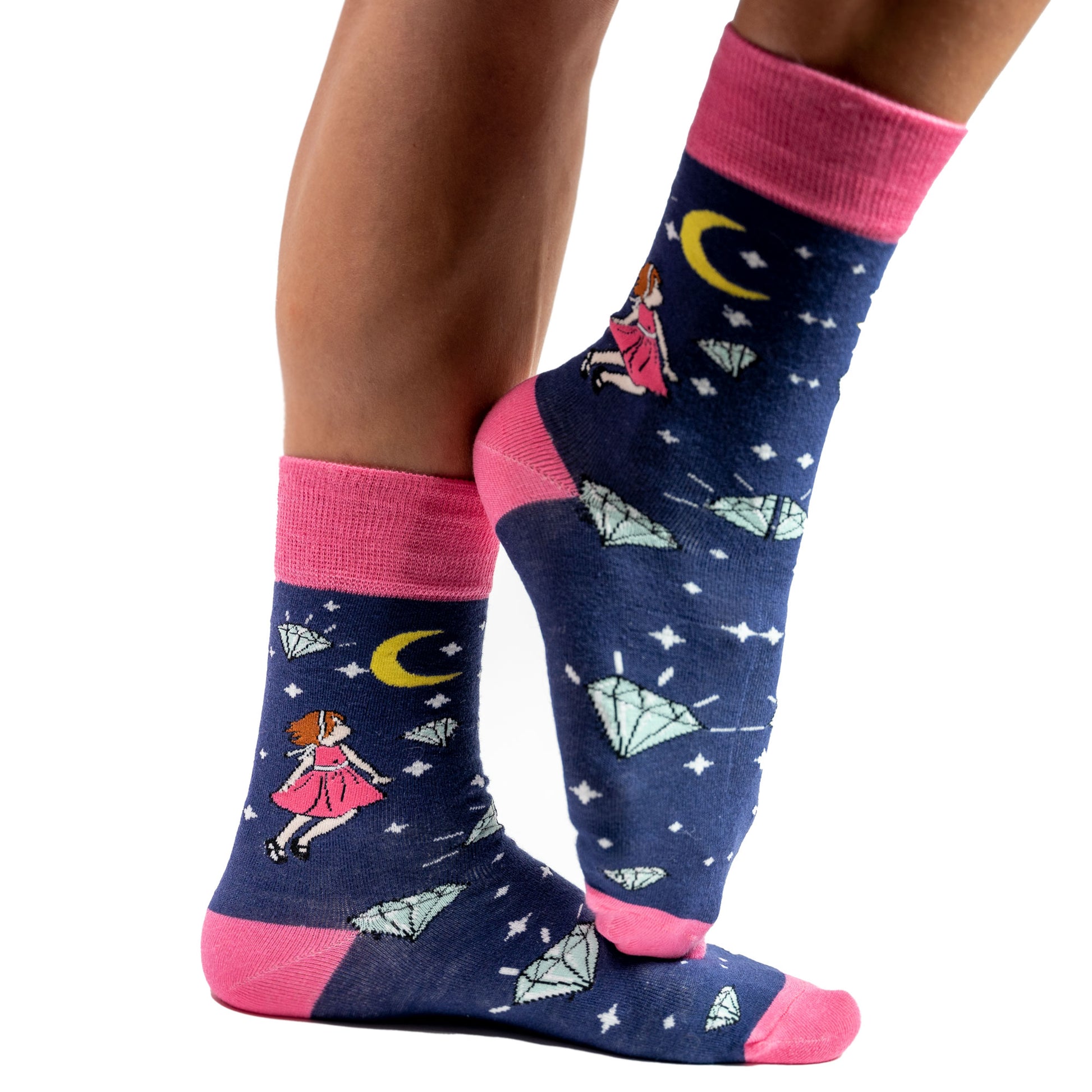 Introducing "Lucy in the Sky with Diamonds" - the enchanting pair of socks that ignites your wanderlust and sparks the magic of adventure. Step into a world of luxury and beauty, where each step is a discovery waiting to unfold. Inspired by one girl's dream to explore the world, these socks now illuminate the skies with dazzling diamonds. Let the journey begin!